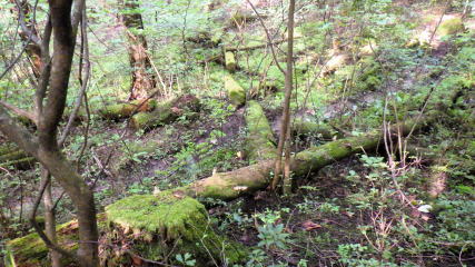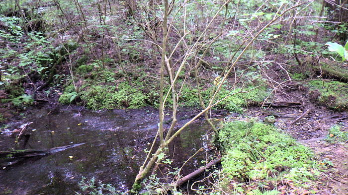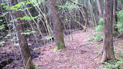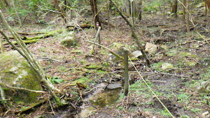 ![]() 渡渉点がありました。ここで左に折れ沢と別れると、平坦ですが少し荒れています。すると… (12:25) |