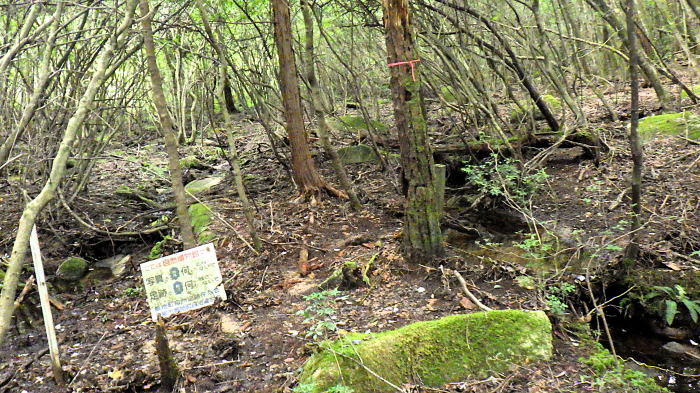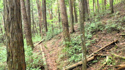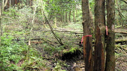 ![]() 左下に看板、「ここは自然博物館です。写真のほかは何もとらないで。飯地町自然史跡保存会」 右側にある沢の右岸沿いにいい距離感のテープが続き、導かれていきます。 |