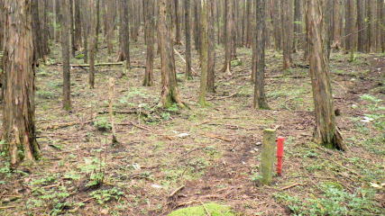 ![]() 登山道を行くと境界杭。この先で尾根に取付きました。 (12:45) |