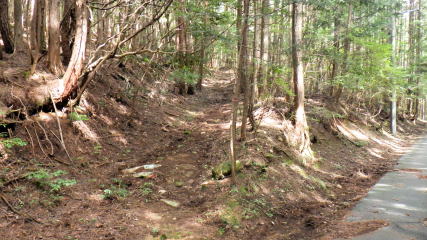 ![]() すぐに舗装林道です。こちらにも大根山ルートがありました。一息ついたら来た道を戻ります。 (13:15) |
