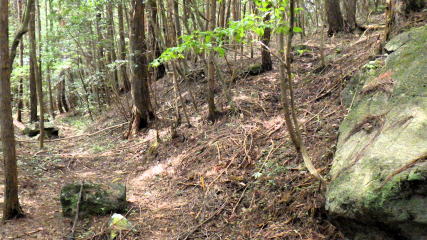 ![]() 尾根に出合い、北東から来た道に合流しました。下山は、その道を歩きましょう。右に折れると… |