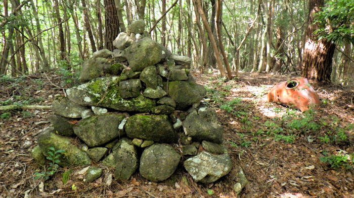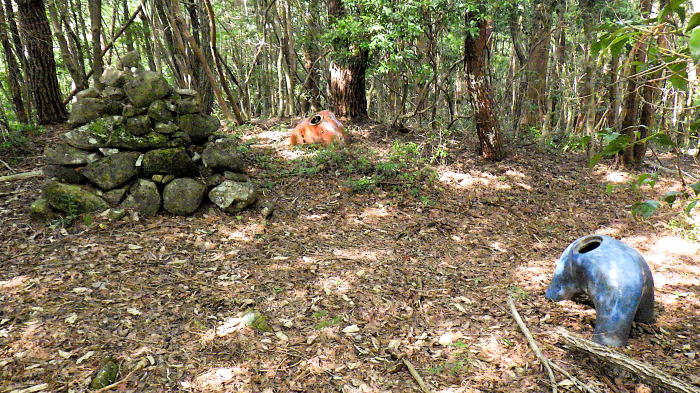 ![]() 「ダイコン・イラスト」の山頂を過ぎるとYAMAPの山頂です。 ケルンと謎の赤・青色の造形物。穴は頭が抜けたのでしょうか? 恵那市山岡町は陶器の産地ですが、山岡陶業文化センターなどの創作活動作品? (13:40) |