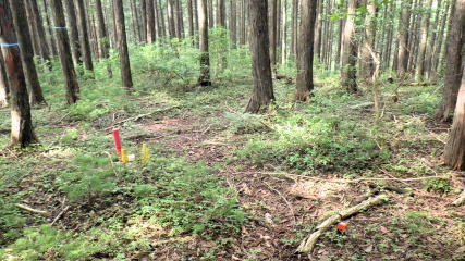 ![]() ケルンから北東尾根を下山します。道は明確でテープも付き、境界杭も有りました。 |