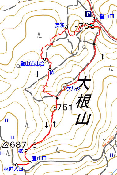 林道駐車地 ↓ 渡渉 ↓ ▲大根山 ↓ 林道入口 ↓ ケルン ↓ 林道駐車地 ※赤線はGPS軌跡 ●は主な分岐点 |