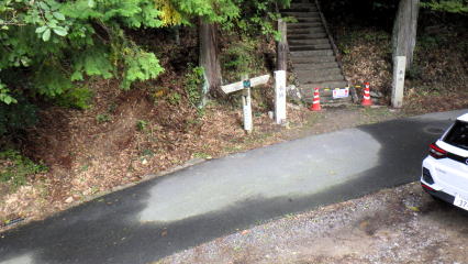 ![]() 急峻な参道は工事中で、ぬかるむ箇所もあります。降るとき、石段で滑るのを防ぐための立入禁止でした。 |