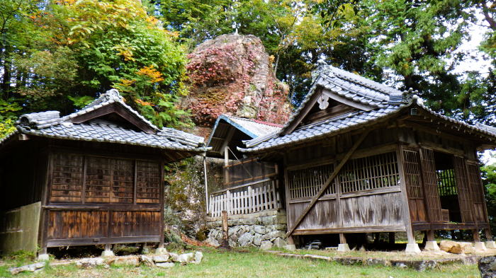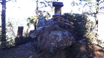 ![]() 600mピークの城跡には刈安神社が建ち、背後に巨岩の烏帽子岩。 写っていませんが、左の大きな籠所は崩壊寸前で、来月解体されます。 廃材の運搬のため、参道整備されているのですね。山頂へは、社殿の左右から回り込めます。 (10:30) |