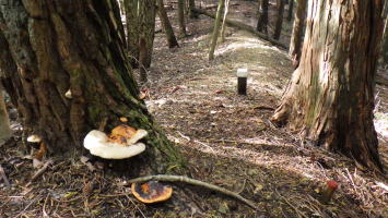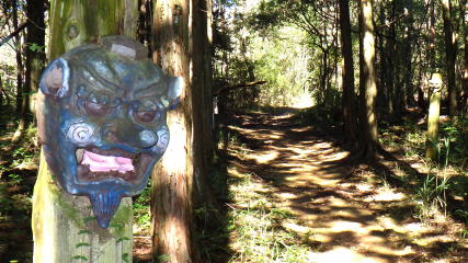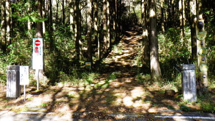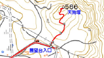 ![]() 右に天狗のお面が睨みを利かす「天狗塚」の標柱、左に「天狗塚展望台入口」案内板。奥に登りだすと… |