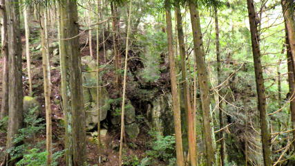 ![]() 神社から降ると分岐があり左折します。石祠が2基あり、神社の基盤である強烈な岩壁が望めました。 駐車地着(11:25) |