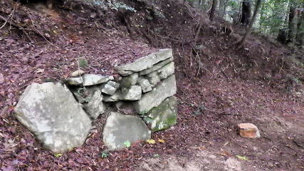 ![]() この山は、刈安城跡で石垣の遺構が残ります。真ん中の石が崩れたようで、右に落ちていました。 |