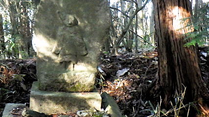 ![]() 土堤が囲む石仏さん。「高根山」の彫字があります。前に崩壊した小屋掛け。道ミスに注意して下山します。 駐車遅着(14:35) |
