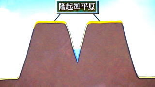 すると木曽川による永年の浸食で平原に深いV字谷が刻まれたのです。(下右) 木曽川中流域には、八百津高原・瑞浪高原・飯地高原といった標高600m前後の隆起準平原が広がっています。