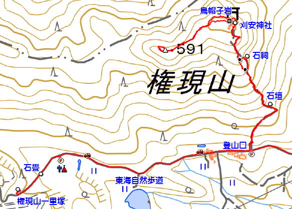 登山口前P ↓ 石祠 ↓ 刈安神社 ↓ ▲権現山 ↓ 烏帽子岩 ↓ 登山口前P ※赤線はGPS軌跡 ●は主な分岐点 |