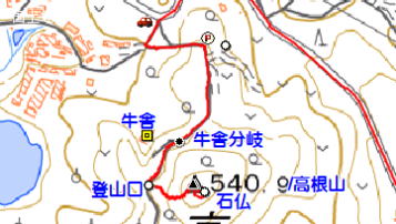 そこで権現山591m、高根山541mのグレーピークを併せて登山します。(YAMAPの地図は、ルートのない山頂のマークは灰色です)