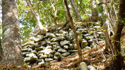 ![]() 先週、一の曲輪跡に来た時、ルートを探していた時、西側で見つけた土止め石垣です。(高さ1.5m・幅8m) |