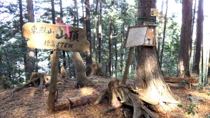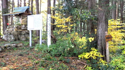 霊場に別れ広場に登ると、祠(左)が祀られています。右下の標柱「歩道入口」から山頂へ。(9:15)広場のベンチから北西の樹間に郡上八幡城(標高320m)、ここも320mです。 ![]() |