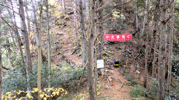 ![]() 尾根を辿ると横幕「山火事用心」の鞍部。三の曲輪前の堀切です。 ここから急登30m。以後も曲輪前には、堀切と急登がセットされています。 |