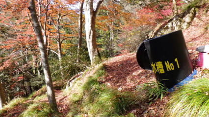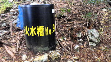 ![]() 登山道沿いに防火水槽が設置。各所の案内地図にその位置が明示されています。 |