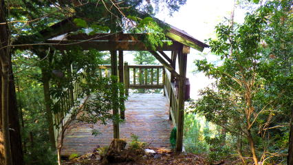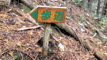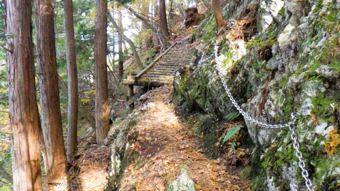 ![]() 3コマ前の辻に戻り、写真右上の指標「歩道」を確認。役に立ちました。 分岐標が差す右、「山頂・乙姫方面→」へ進みます。 すると桟橋と鎖場。強烈な防御地形に本丸(一の曲輪)は建てられたのです。 |