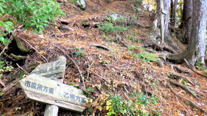 ![]() 赤谷分岐・二の曲輪跡を過ぎると、辻に倒れた分岐標。左折して「赤谷山城跡/一の曲輪跡」へ登ります。 (10:30) |