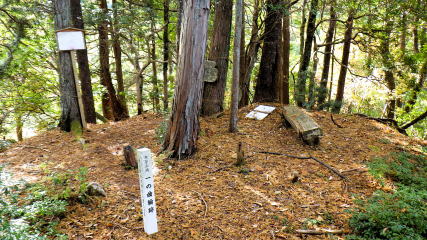 ![]() 本丸を南へ迂回すると30m級大木の原生林に驚嘆します。左の山腹道を辿ると東殿山578m山頂です。 (11:15) |