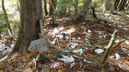 ![]() 赤谷山城跡。三方をロープが囲い「危険進入禁止/来た道を戻る」 確かに切れ落ちた岸壁…辻へ戻ります。 (10:32) |