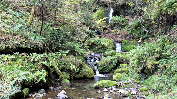 ![]() 砂防堰堤に着くと沢を遡る歩道があり、一番上の奥が乙姫滝(落差5m)。 滝水は夏冬とも14℃で、純良清浄で茶の湯には絶好です。 |