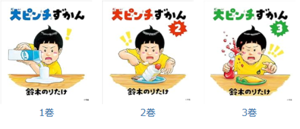 ●誕生日ケーキをスプーンですくっおうとしたら倒れそうに! ●ご飯粒を踏んだ! ●外でズボンのゴムが切れた! ●ケチャップのふたを開けて出そうとしたら…ケチャップが飛んだ! ●へんな日焼けをした! ●割りばしがうまく割れない! 2023年に「大ピンチ2」、2025年に「大ピンチ3」と続き、累計250万部を突破しました。3冊は、セットで4950円です。鈴木のりたけさんは現在50才、のりにのり、「大ピンチ展」が企画され、2025年夏から全国のデパートなどで開催されています。 名古屋は、ジェイアール名古屋タカシマヤ10F、期間は、12/23(火)~1/12(月・祝)。一般入場料1200円でチケットの販売は、セブンチケットで11/25(火)~12/22(月)です。混雑緩和のため事前日時予約優先制があります。 |