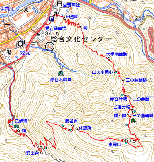 愛宕駐車場 ↓ 赤谷城曲輪跡 (大手曲輪跡) (三の曲輪跡) (二の曲輪跡) (一の曲輪跡) ↓ ▲東殿山 ↓ 休憩所 ↓ 乙姫滝 ↓ 愛宕駐車場 ※赤線はGPS軌跡 ●は主な分岐点 □は曲輪跡 ●は主な防火水槽 |