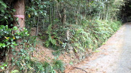 ![]() 上地形図右端の三月田古墳(サンガツデン)から左へ進めば、広い駐車場です。まず車道のヘアピンカーブを歩きます。 (9:45) |