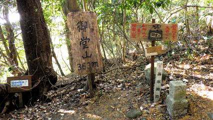 ![]() 御堂山山頂364m四等三角点。1469年丹野城(タンノ)が築かれ、翌年悲しくも落城しました。展望は良くありません。 (13:30) |