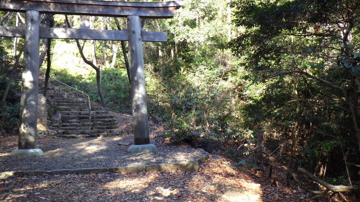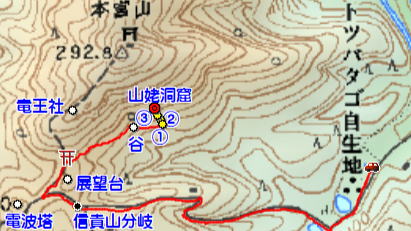 ![]() 数分で鳥居に出合います。後に階段は、本宮山の参道です。 鳥居の手前右にある降り道が、山姥の洞穴入口。 |