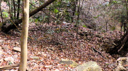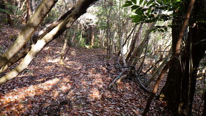 ![]() 前に堀切のようなU字谷。写真左の細い木のトラロープで降り、下へ7,8m降ると… |