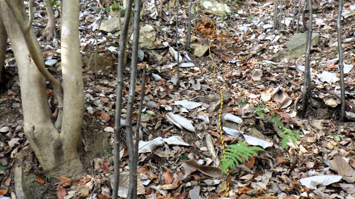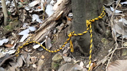 ![]() 左向こうに斜めの黒い木。その前にトラロープが、右下に垂れています。登山道に分かれ、登るポイントです。 |