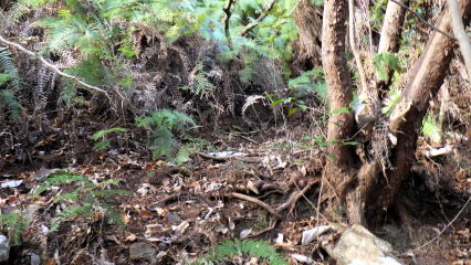 ![]() ①+②で急斜面を5分。踊り場に上がると、正面は酷いシダ藪です。右方向にあるロープ③を手に取り… |