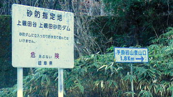 ![]() 上親田集落で道標「手掛岩山1.8km→」。この後、3ヶ所の道標が案内します。林道は悪路。 |