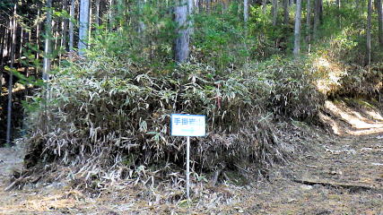 ![]() ![]() さて本日の謎解き。てくてくマップ(↑)には、①「頂上から集落や裏木曽の山並み…」~木が伸びて眺望は有りません。②山名の手掛岩は、「山頂から少し下がった所にある石」、「看板有り」~(上右)支柱らしい杭だけ。「岩の上から東白川小学校が見える」周囲の植林で眺望はありません。 |
