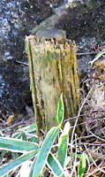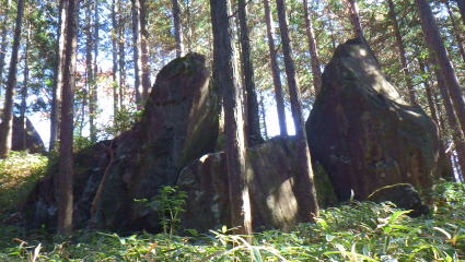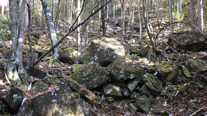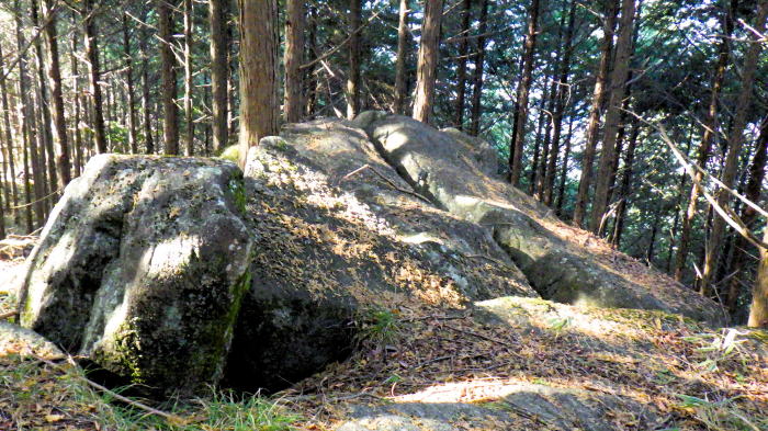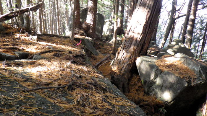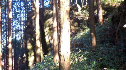 ![]() 杭の近く、手掛岩とおもえる巨岩は、尾根の右にあり、これなら子供が岩上に立てます。 |