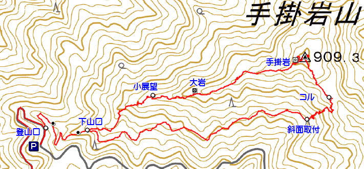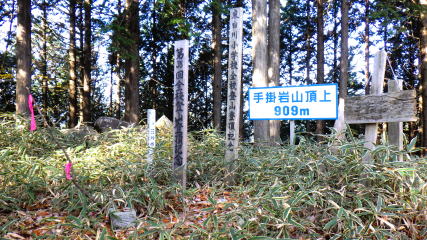 ![]() 手掛岩山909m三等三角点。東村山小学校の全校登山登頂記念柱、H23年・H29年・R5年が立ちます。 (10:45) |