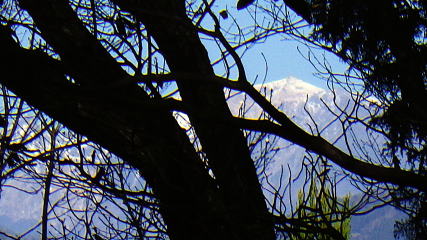 ![]() 落ち葉道からささやかな小展望。北に御嶽山剣ヶ峰3063m、その右下の王滝頂上2936mは、雪が少ない。 |