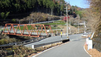 ![]() R258を走ると白川に赤い新魚戸橋。たもとにバス停東小学校西口があり、橋手前で右折します。 |