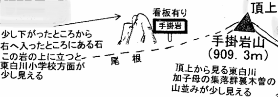 東白川小学校では、手掛岩山を6年間に1度全校登山します。山頂直下に「手掛岩」と呼ばれる巨岩群があり、伝説が残っています。 旅の僧が狼に襲われた際、大岩に手を掛けてよじ登り、姿を消しました。そこから手掛岩と呼ばれるようになったと伝えられています。 昔は雨乞いや陽乞いの儀式も行われ、村人にとって信仰の対象でもありました。教科書は、東白川村公式サイト「てくてくマップ」です。 |