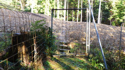 本日2枚目の防獣網扉に出ます。右の石柱に「北畠具行郷」と彫られ、入って50m登ると…
