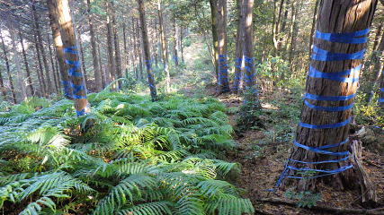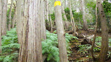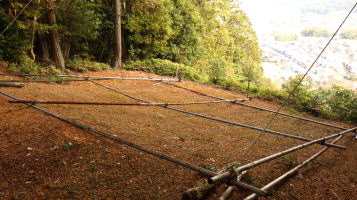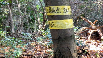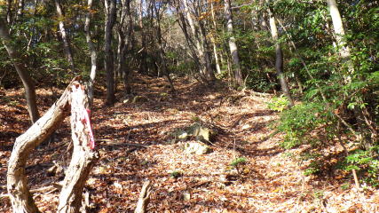 「北畠具行墓」の東端の古いピンテから入林。踏み跡を探して急斜面を登ります。 |