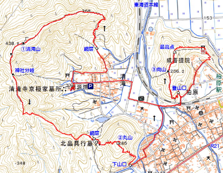 清滝山から南へ下山します。徳源院分岐を過ぎ、登り返して左カーブ。石段を降り、細い道を左折すれば… |
