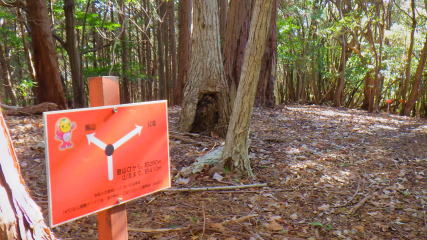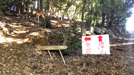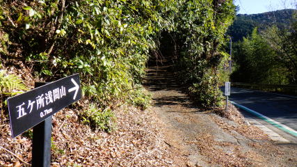 ![]() 愛洲の里公園を確認後、500m県道を走ると道標「五ヶ所浅間山→」。手前の路肩に駐車して出発します。 (10:00) |