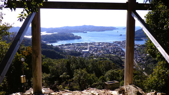 ![]() 鳥居からは、五ヶ所湾の島々とリアス式海岸の絶景。 全国で1300社ある浅間神社は、安産と火防の神浅間大神(アサマノオオノカミ)から由来します。 |