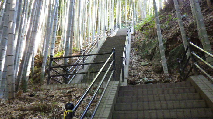 ![]() 駐車場から西に歩くと「ここは海抜5mです」の表示。そしてこの鍛錬の段を108段登ります。 「津波一次避難場所」に出て、愛洲氏の五ヶ所城跡から竹林を抜ければ… |
