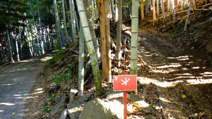 ![]() 往きの道を戻ると10分でY字分岐点。左を取り、往きと違う道で下山します。 (13:15) |