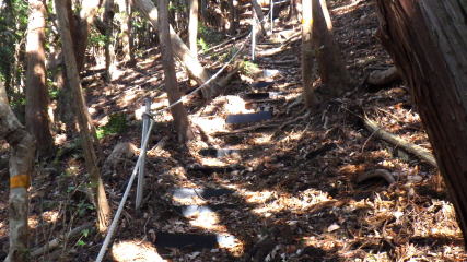 ![]() 山頂手前で斜度がきつくなりました。補助ロープ、プラ階段は、馬の山だけどありが闘牛士。 |