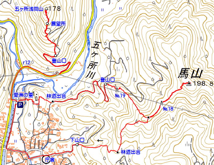 【2座】愛洲の里公園P→登山口→▲馬山→下山口→愛洲の里公園P ※赤線はGPS軌跡 ●は主な分岐点 |